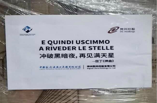 防疫物資的外包裝上,用中文和意大利文醒目地寫著“沖破黑暗夜,再見滿天星”。這句出自意大利著名詩人但丁的《神曲》詩句,表達了科捷和中技公司對意大利人民早日戰(zhàn)勝疫情、重回昔日繁榮的的美好祝福。