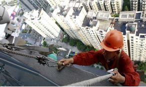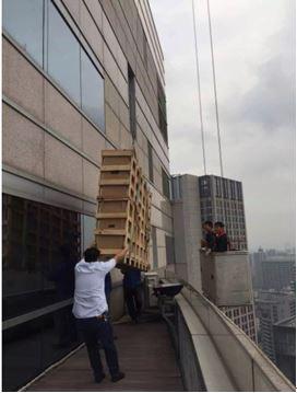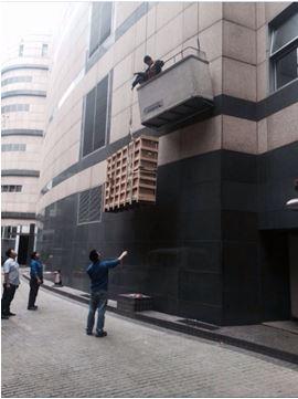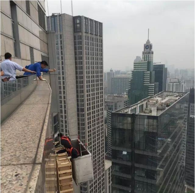 設備上兩條繩子,兩人各拉一條,就是為了避免被吊設備撞了大樓外墻。