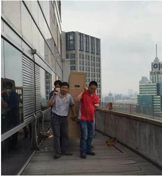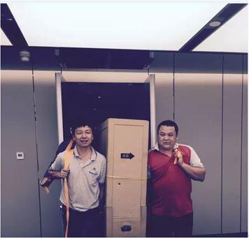 咬牙堅持,曙光就在前方,汗如雨下的高端突擊隊終于順利將設備抬進35層會議廳。
