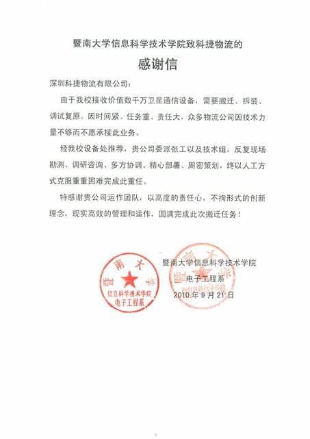 以下附暨南大學致科捷物流的感謝信: