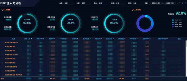此次雙十一,科捷KingKooData人力用工管理系統(tǒng)根據(jù)銷量預(yù)測,精準(zhǔn)的預(yù)安排了全國近三萬名臨時(shí)勞務(wù)的派工和管理。這是保障各倉高效發(fā)貨的關(guān)鍵舉措。系統(tǒng)將前臺(tái)供應(yīng)商門戶與供應(yīng)商管理系統(tǒng)進(jìn)行對接,在中臺(tái)設(shè)置人力管理平臺(tái),連接后臺(tái)核算管理系統(tǒng),將大促的人力管理線上流程化,同時(shí)將用工申請、用工確認(rèn)、對賬、報(bào)價(jià)、付款等各環(huán)節(jié)相互關(guān)聯(lián),降低法務(wù)、財(cái)務(wù)風(fēng)險(xiǎn)。且倉內(nèi)效能由系統(tǒng)進(jìn)行統(tǒng)計(jì)與計(jì)算,降低了目前人工計(jì)算的錯(cuò)誤率與統(tǒng)計(jì)工作量。每個(gè)倉庫的實(shí)時(shí)UPH進(jìn)度和崗位人效一目了然,無需到現(xiàn)場既可運(yùn)籌帷幄,實(shí)現(xiàn)了全國一盤棋。