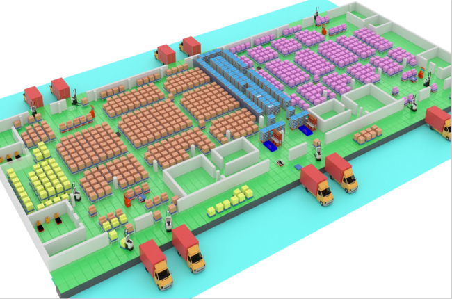 (圖注)整倉實際上分了四塊業(yè)務(wù),左右黃色的區(qū)域是人工揀選區(qū),中間橙色部分是移動終端的B2B業(yè)務(wù),藍色部分是手機的B2C業(yè)務(wù),紫色部分是神州數(shù)碼的業(yè)務(wù)。在這個全倉的布局來看,整個規(guī)劃實際上是一個B2B和B2C業(yè)務(wù)的場景。