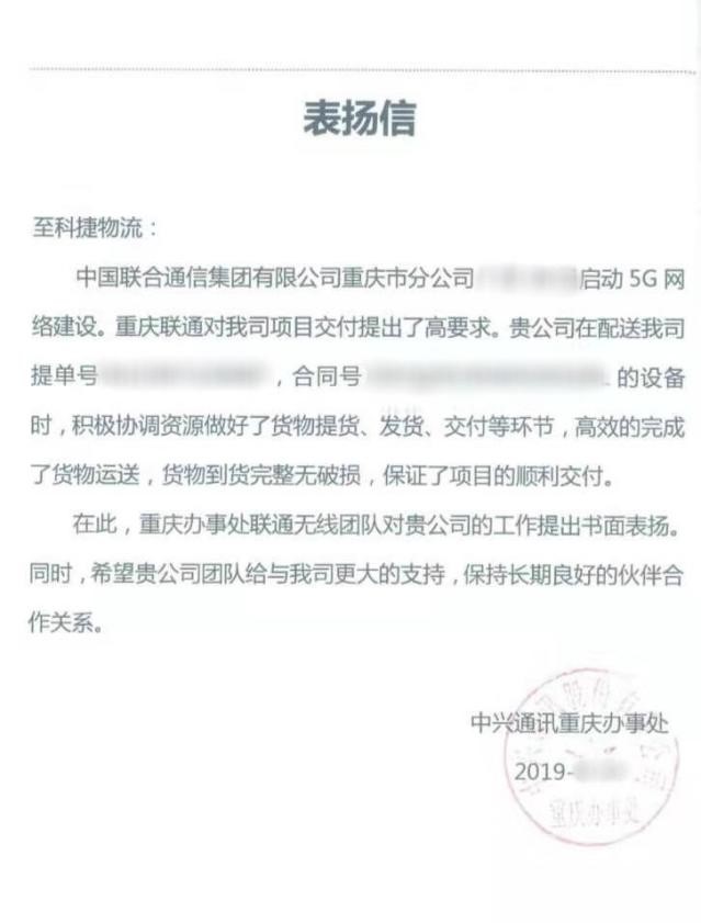 中興通訊發(fā)給科捷的表?yè)P(yáng)信